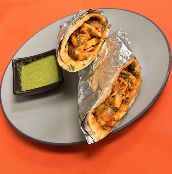 Marinated protein, tomatoes, onions, yogurt, mint chutney, tamarind chutney and makhani sauce wrapped in fresh naan.